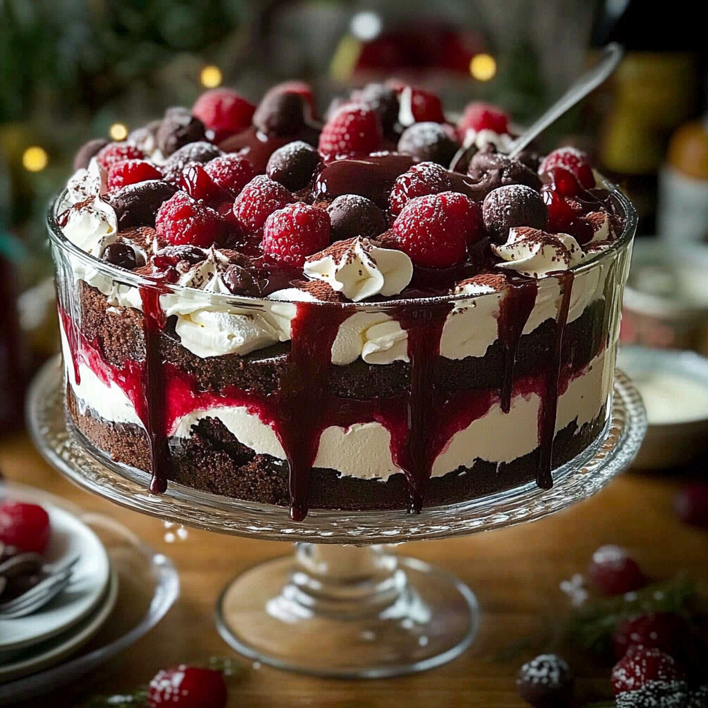 - This Black Forest Trifle for Christmas combines layers of rich chocolate cake, creamy whipped topping, and tart cherries