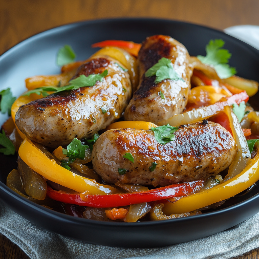 Start by searing the sausages for a rich, caramelized flavor. Once they’re golden, add onions and peppers, followed by broth to create a tender, savory dish.
